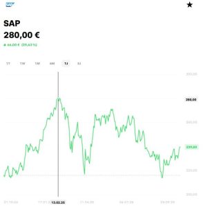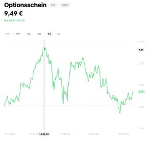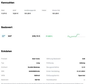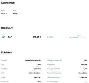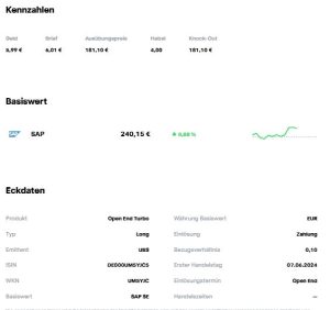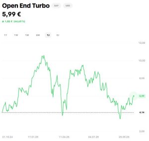 Die Kurve läuft analog zur SAP-Aktie mit dem Unterschied, dass sowohl Anstieg als auch Abfall deutlich stärker funktionieren. In der Theorie sollte es genau der gleichbleibende Faktor 2 sein, d.h.: Während die SAP-Aktie beim Peak einen Anstieg um 29 % hatte, sollte das 2x Knockout einen Anstieg um 58% haben. In der Praxis bei Trade Republic hatte das Derivat einen Anstieg um … %.